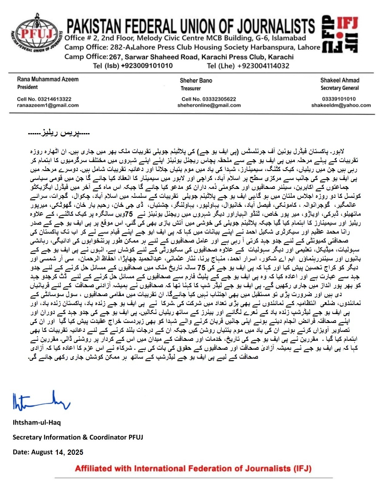 Lahore: Pakistan Federal Union of Journalists (PFUJ) leadership and other speakers while speaking in Platinum Jubilee celebrations have vowed to continue their struggle for the freedom of speech & expression and for the rights of working journalists. The Platinum Jubilee celebrations of the Pakistan Federal Union of Journalists (PFUJ) are underway across the country. In the first phase of these eighteen-day celebrations, fifty regional unions affiliated to PFUJ are organizing various activities in their respective cities, including rallies, cake cutting, seminars, candle vigil in memory of the martyrs and prayer ceremonies. In the second phase, PFUJ will organize seminars at the central level in Islamabad, Karachi and Lahore, in which leaders of national political parties, senior journalists and government officials will be invited, while a two-day meeting of the Federal Executive Council will be held in Multan later this month. In connection with the PFUJ Platinum Jubilee celebrations, regional unions in Islamabad, Chakwal, Gujrat, Sarai Alamgir, Gujranwala, Kamonki, Faisalabad, Khanewal, Bahawalpur, Bahawalnagar, Chishtian, Rahim Yar Khan, Ghotki, Mirpur Mathelo, Daharki, Obaro, Mirpur Khas, Tando Allahyar and other cities organized cake cutting, rallies and seminars on the 75th anniversary, while fireworks were also set off to celebrate the Platinum Jubilee. On this occasion, PFUJ President Rana Muhammad Azeem and Secretary general Shakeel Ahmed said in their statements that PFUJ has been struggling for the journalistic community of Pakistan since its inception and is trying to provide all possible services to working journalists, including payment of salaries, residential facilities, medical, educational and other facilities, as well as security of journalists. They paid tribute to the founders and senior leaders of PFUJ, MA Shakoor, Israr Ahmed, Minhaj Barna, Nisar Usmani, Abdul Hameed Chapra, Ahfaz-ur-Rehman, CR Shamsi and others and said that the 75-year history of PFUJ is full of struggle to solve the problems of journalists in the country and reiterated that they will continue the struggle to solve the problems of journalists through the platform of PFUJ. The PFUJ leadership said that journalists have always made sacrifices for the freedom of the press and if necessary, they will continue the same in the future. Local journalists, civil society representatives, and district administration representatives also participated in these events in large numbers. The participants raised slogans of PFUJ Zindabad, Pakistan Zindabad, and PFUJ Leadership Zindabad and took out rallies with banners. A great tribute was also paid to the martyrs who sacrificed their lives during the struggle of PFUJ and while performing their journalistic duties. Candles vigils were also held in their memory, while prayer ceremonies were also organized to raise their ranks. The speakers shed light on the history, services, and role of PFUJ in the field of journalism. The speakers said that PFUJ has always spoken about freedom of the press and the rights of journalists. The participants reiterated their commitment to continue their efforts with the PFUJ leadership for freedom of speech and expression